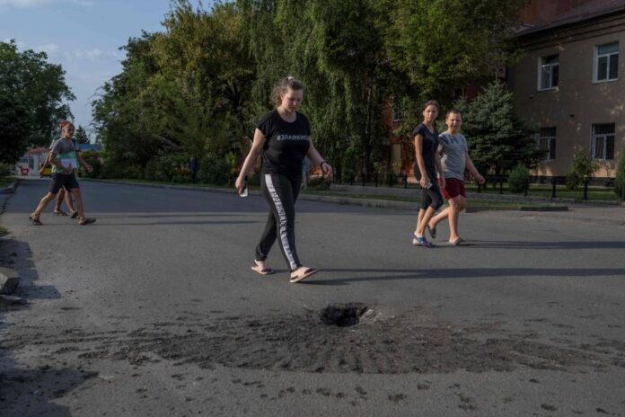 People walk next to a crater left by a shelling by Russian forces in the Ukrainian city of Marhanets, on August 12, 2022 amid the Russian invasion of Ukraine. — AFP pic