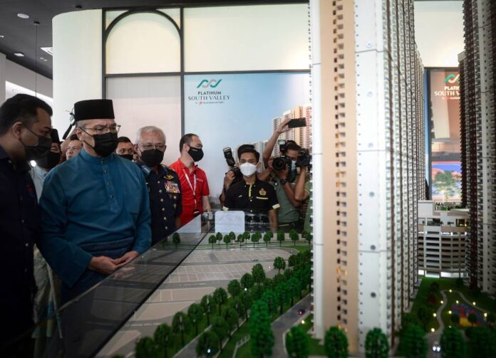 Senior Defence Minister Datuk Seri Hishammuddin Hussein (second left) looking at a building model at the Ministry of Defence’s Housing Blueprint 3.0 Pre -Launch Ceremony in Kuala Lumpur, May 20, 2022. — Bernama pic