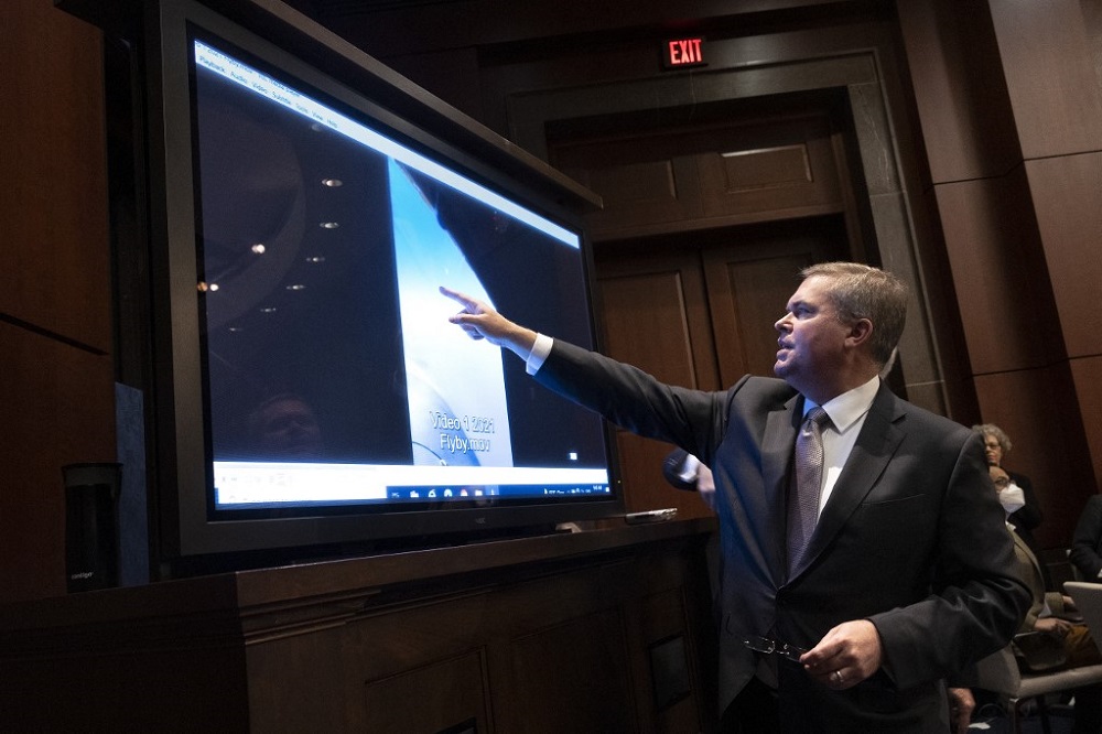 US Deputy Director of Naval Intelligence Scott Bray explains a video of an unidentified aerial phenomena, as he testifies before a House Intelligence Committee subcommittee hearing at the US Capitol May 17, 2022. — Getty Images via AFP