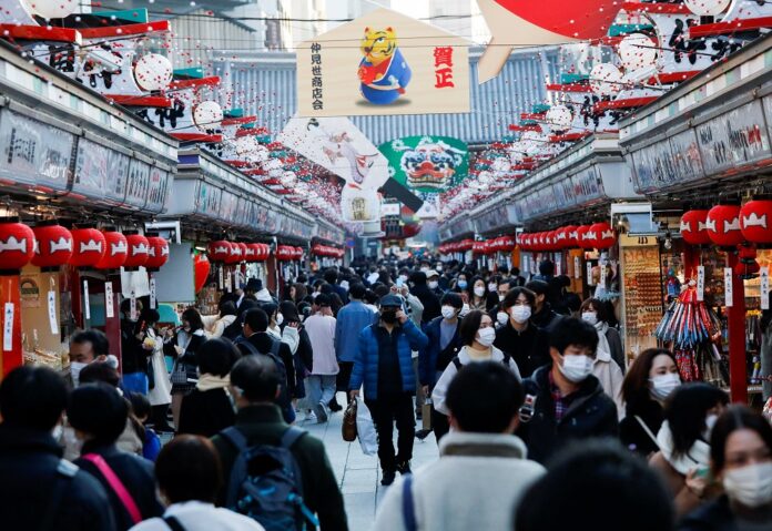 Visitors wearing protective face masks walk under decorations for the New Year at Nakamise street leading to Senso-ji temple at Asakusa district in Tokyo, Japan, December 24, 2021. ― Reuters pic