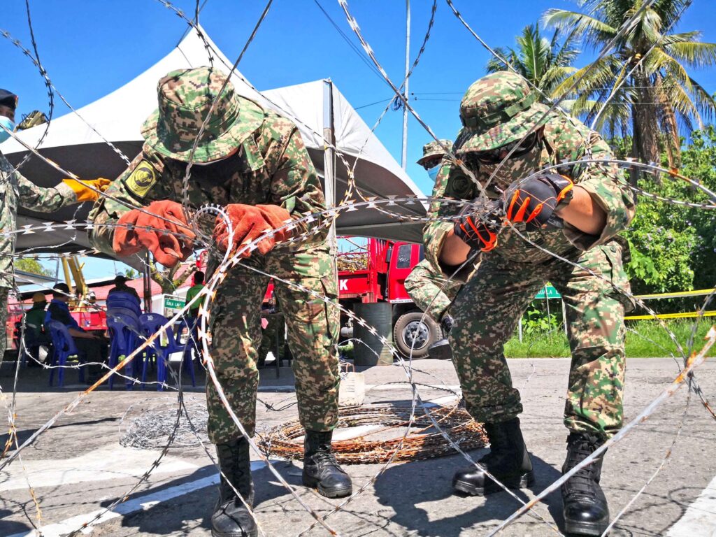 Army personnel setting up barbed wire in Kg Likas after the area was placed under EMCO.