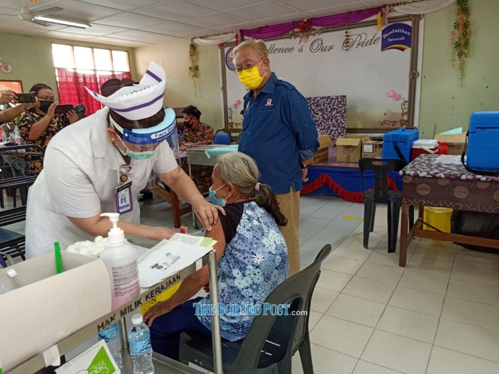 Sikie observes as a senior citizen receives the Covid-19 vaccine. — Borneo Post pic