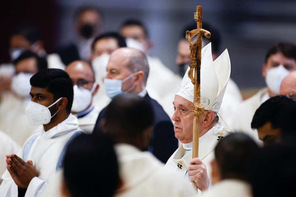 Pope Francis arrives to celebrate Mass to mark the World Day of Peace in St. Peter’s Basilica at the Vatican, January 1, 2022. — Reuters pic